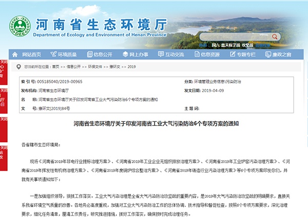 日前,河南省生態環境廳發布了《河南省2019年非電行業提標治理方案》、《河南省2019年工業企業無組織排放治理方案》、《河南省2019年工業爐窯污染治理方案》、《河南省2019年揮發性有機物治理方案》、《河南省2019年度鍋爐綜合整治方案》、《河南省2019年鑄造行業污染治理方案》等6個專項方案,詳情如下: