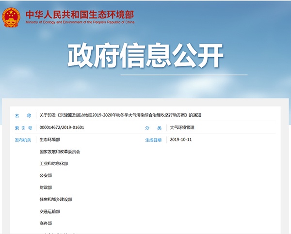 2019年10月11日,生態環境部聯合國家發展和改革委員會、工業和信息化部、公安部、財政部、住房和城鄉建設部等發布關于印發《京津冀及周邊地區2019-2020年秋冬季大氣污染綜合治理攻堅行動方案》的通知,詳情如下:
