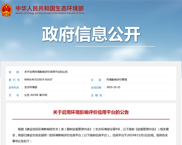 2019年10月25日,生態(tài)環(huán)境部發(fā)布關(guān)于啟用環(huán)境影響評(píng)價(jià)信用平臺(tái)的公告,詳情如下: