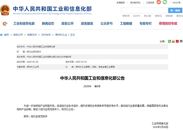 2020年3月3日,工業和信息化部發布了《鋁行業規范條件》,詳情如下: