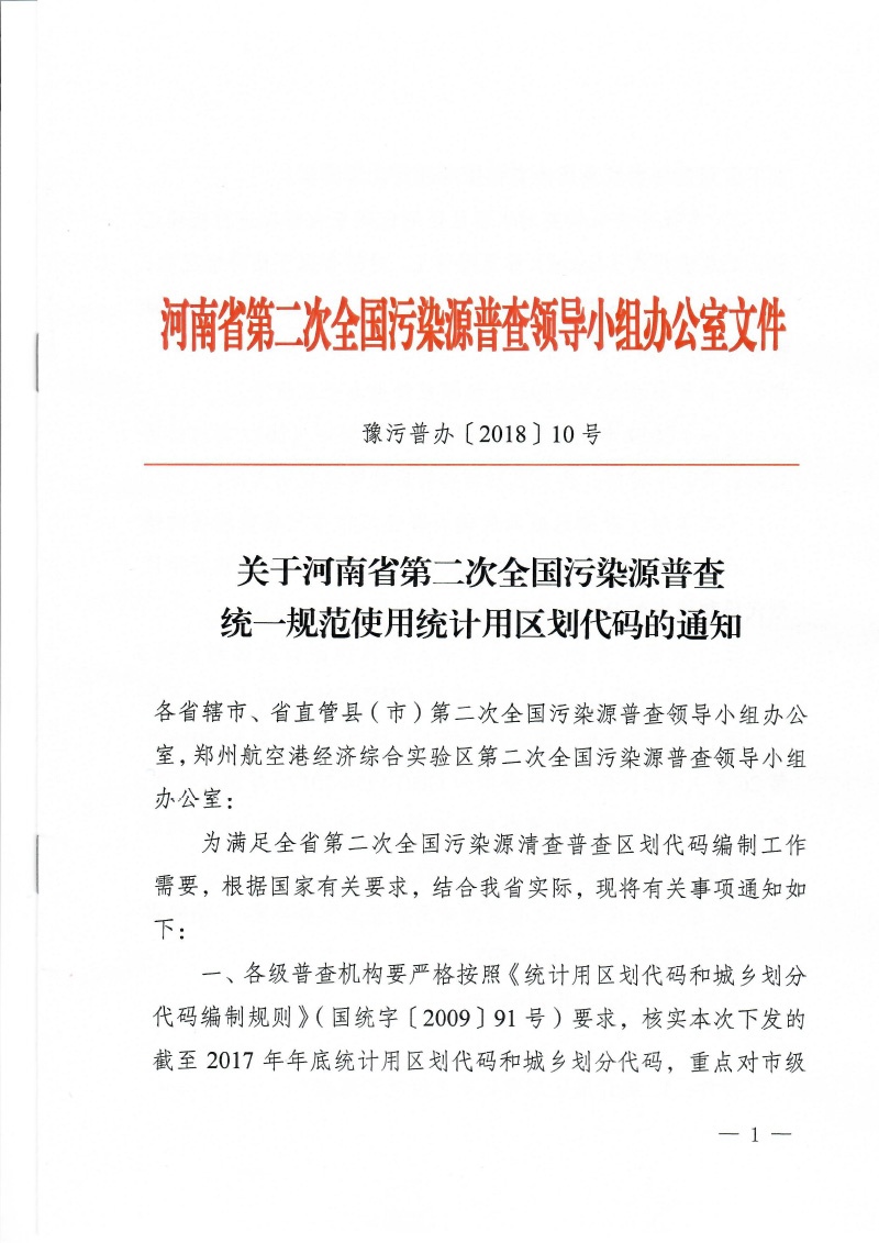 豫污普辦【2018】10號關(guān)于河南省第二次全國污染源普查統(tǒng)一規(guī)范使用統(tǒng)計用區(qū)劃代碼的通知
