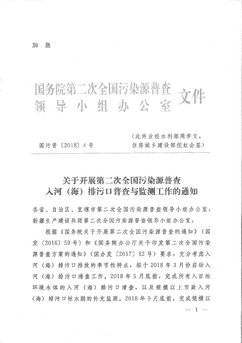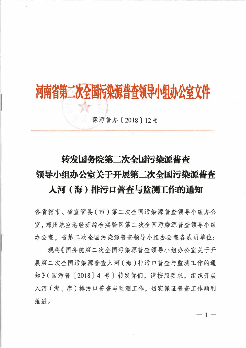 豫污普辦【2018】12號(hào)轉(zhuǎn)發(fā)國(guó)務(wù)院第二次全國(guó)污染源普查領(lǐng)導(dǎo)小組辦公室關(guān)于開(kāi)展第二次全國(guó)污染源普查入河(海)排污口普查與監(jiān)測(cè)工作的通知