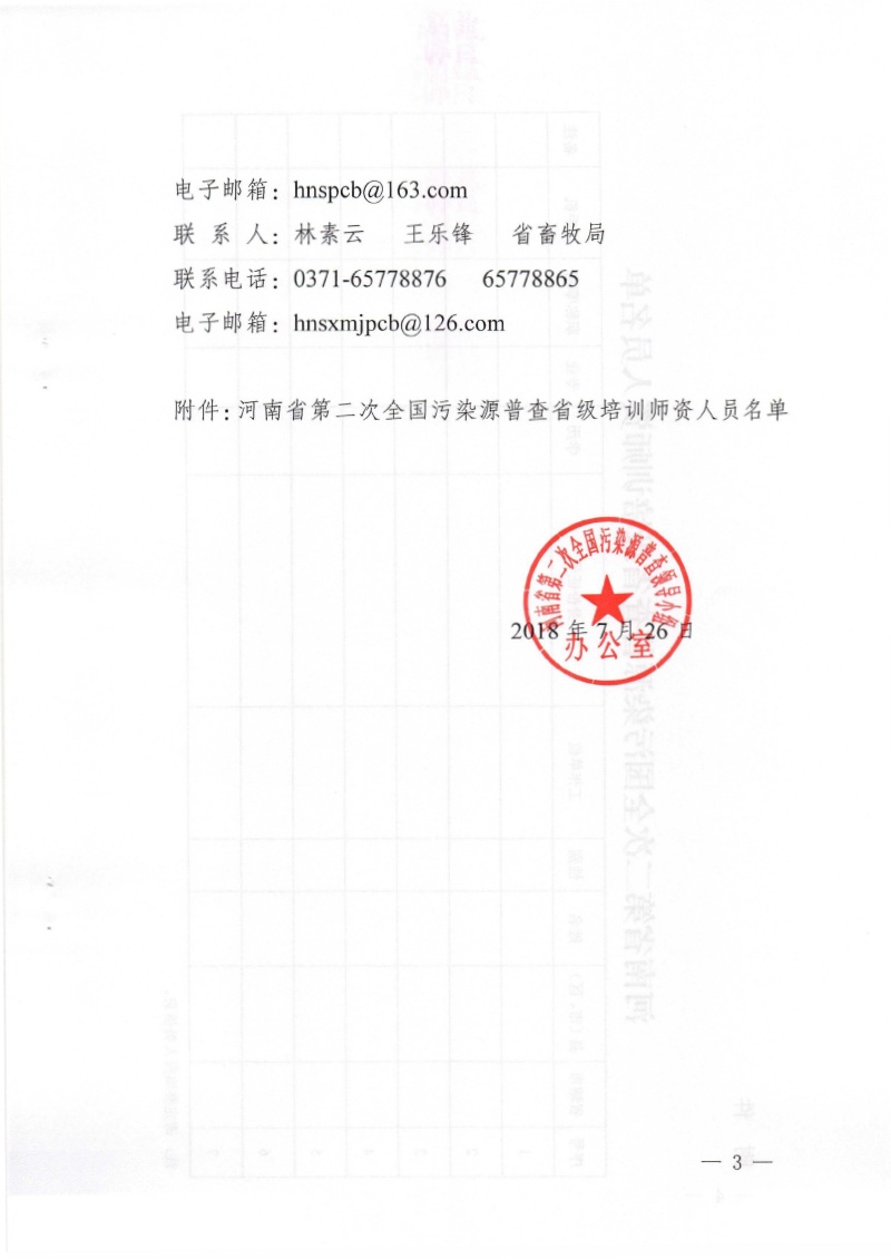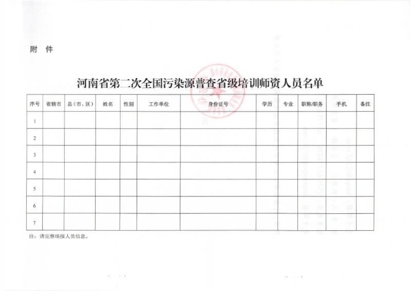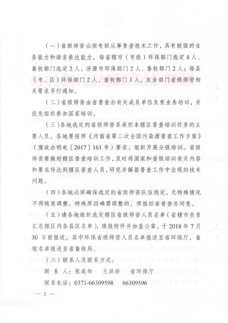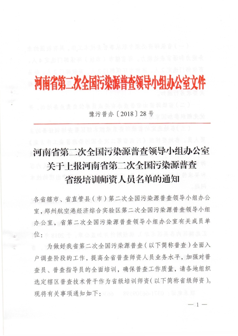 豫污普辦【2018】28號)關于上報河南省第二次全國污染源普查省級 培訓師資人員名單的通知